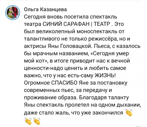 Спектакль "Сегодня умер мой кот", несмотря на название, несмотря на невеселый сюжет и отсутствие хэппи-энда, получился позитивным. Легкость рассказа, музыка, как неотъемлемый персонаж-всё подчеркивает, что все же жизнь прекрасна, ведь в ней есть все, хотя и много непубличного, неприятного, невеселого...а как же без этого.. А кот с самого начала выбрал жизнь-и прожил ее, согревал телом, хвостом и ушами тех, кто так в нем нуждался. Как всегда-ни одного лишнего звука, шага, жеста.